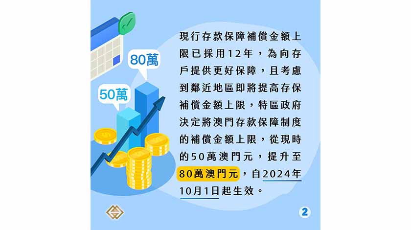 【特訊】存款保障制度的補償金額將自2024年10月1日起提升至80萬澳門元。現行補償金額上限已採用12年,為向存戶提供更好保障,且考慮到鄰近地區即將提高存保補償金額上限,特區政府決定將澳門存款保障制度的補償金額上限,從現時的50萬澳門元,提升至80萬澳門元。新的《存款保障制度的補償限額》行政法規昨日在《澳門特別行政區公報》刊登,將自2024年10月1日起生效。