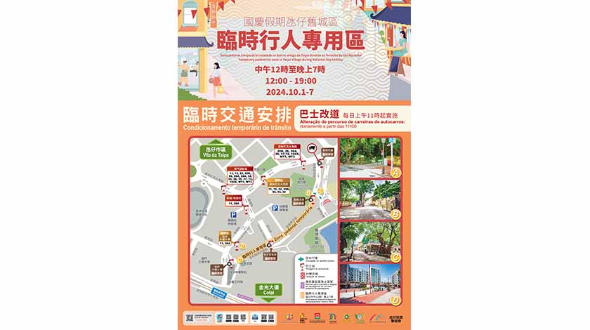 政府再在國慶假期於氹仔舊城區實施臨時行人專用區,範圍由飛能便度街與素啤古街交界(嘉模泳池巴士站前),至告利雅施利華街與巴坡沙總督街交界(路氹歷史館),當中包括兵房斜巷至嘉路士米耶馬路部份路段。