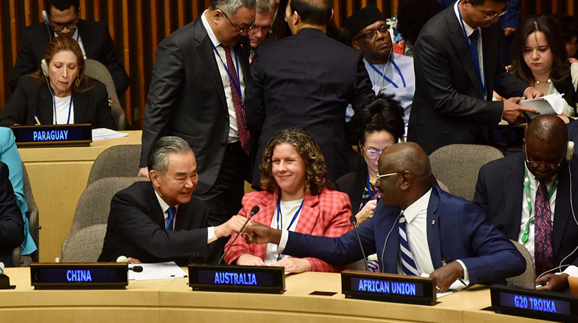 【中新社聯合國9月26日電】 (記者 沙晗汀)當地時間9月25日,中共中央政治局委員、外交部長王毅在紐約聯大期間出席二十國集團外長會。會議由巴西外長維埃拉主持,巴西總統盧拉、南非總統拉馬福薩、二十國集團成員和嘉賓國代表、聯合國秘書長古特雷斯、第79屆聯大主席菲勒蒙等與會。