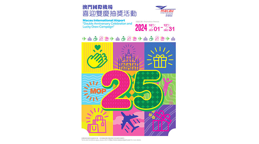 【特訊】澳門國際機場為與市民及旅客共同迎國慶‧賀回歸,將於2024年10月1日至12月31日推出“澳門國際機場喜迎雙慶抽獎活動”,送出一萬份澳門國際機場購物及餐飲消費劵。旅客只需於活動期間內在澳門國際機場官網內的活動網頁登記即可獲得抽獎機會,赢取豐富禮品。