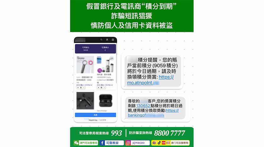 【特訊】近日,司法警察局先後接獲多名市民舉報,稱收到假冒本澳銀行及電訊商名義發出的短訊,內容聲稱“客戶積分即將到期”,誘騙市民點擊短訊內附帶的連結,進入連結後會跳轉至一個假冒相關銀行或電訊商的網頁,並要求市民輸入信用卡資料以低價加積分換取禮品,藉此盜取市民的信用卡資料以進行非授權之大額交易。