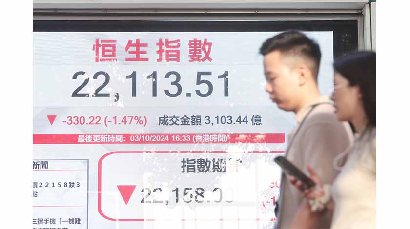 【香港中通社10月3日電】(記者 譚暢)港股急升6天後,3日稍見技術性回吐。恒指當日收報22113點,跌330點或1.5%。大市全日成交金額約3103.4億港元。