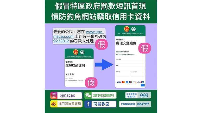 【特訊】司警局於昨日發現有騙徒假冒澳門特區政府名義向市民隨機發送虛假手機短訊,訛稱市民有罰款需要點擊短訊內附帶之連結處理,有關連結進入後為一個假冒「澳門特別行政區政府入口網站」的網頁,倘市民按照頁面要求輸入車牌號碼查詢後,會訛稱市民有「交通違例」罰款需要透過信用卡繳交,以此套取市民信用卡資料後隨即進行未經授權之大額交易,令市民蒙受損失。