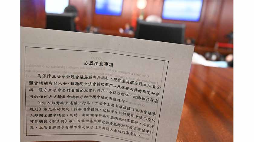 注意事項也指出,立會主席可依法對違反上述的人士採取請離會議室等適當措施,且有關行為或已構成擾亂特區機關運作罪,會方將要求有關執法部門依法追究其刑事責任。