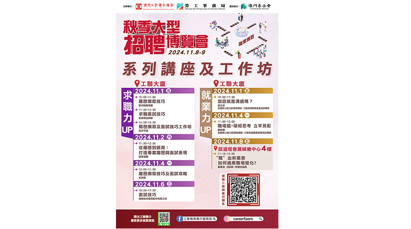 有意參與系列講座及工作坊的本澳居民,歡迎線上報名,即日起登入以下專頁進行線上報名登記https://www.dsal.gov.mo/zh_tw/standard/autumn_jobfair_workshop_2024.html,成功報名人士會收到短訊確認,憑短訊簽到進場參與,名額有限,額滿即止。本次招聘會上逾40間企業參與,提供逾2500個崗位;入場報名時間將於10月25日開放網上預約入場;如對講座及工作坊有興趣,可於辦公時間內致電勞工事務局(電話:28722108)或工聯職介部(電話:28569362)查詢。