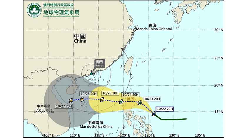 【本報訊】氣象局預測,位於菲律賓以東的秋颱「潭美」,未來數日向偏西方向移動,明日(周四)下午至後日早上將進入本澳八百公里範圍,大致移向海南島一帶,氣象局將適時發出熱帶氣旋信號。