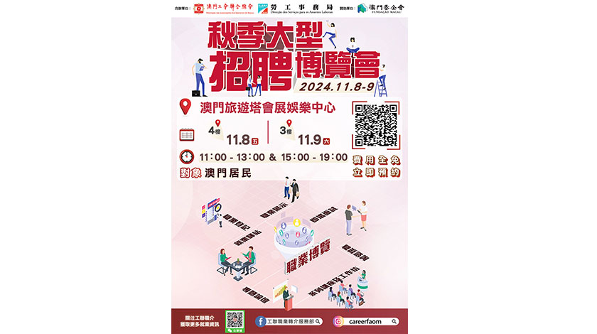 【特訊】為促進澳門居民的就業機會,提升就業質量,澳門工會聯合總會與勞工事務局將於11月8日至9日假澳門旅遊塔會展娛樂中心舉辦“2024秋季大型招聘博覽會”,是次博覽會設即場面試、系列講座及工作坊、職業攤位、職涯規劃及交流論壇,為求職者的職業方向、求職策略和職業發展提供指導。運用職工服務體系助力他們策略性調整職涯路徑,在經濟發展與就業環境的新關係中,獲得穩定良性的健康職業發展。