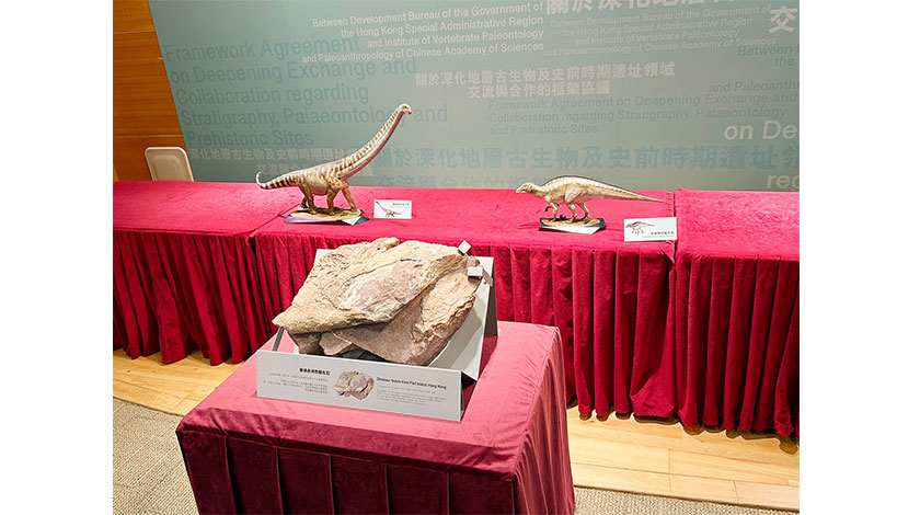 【圖片新聞】香港首次發現白堊紀時期恐龍化石!23日,特區政府發展局舉辦記者會公佈,該恐龍化石是今年在香港赤洲島發現,專家推測是屬於距今約1億4500萬年至6600萬年前的白堊紀時期的大型、年長的蜥腳類恐龍或鳥臀類恐龍。化石將於25日起在香港文物探知館向公眾展出。(香港中通社)
