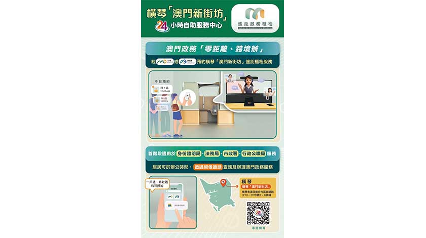 特區政府近年先後推出“一戶通"、“商社通"和“公務通"三個電子服務平台,讓居民、企業、社團以及公務人員不受地域限制,隨時隨地線上辦理澳門政務服務。現時“一戶通”的開戶人數已逾61.8萬,為居民提供逾430項服務及功能,而“商社通”可提供逾90項服務,有逾1.5萬個實體已開立帳戶,當中公司帳戶逾1.1萬個。與此同時,考慮到有部分具特殊性質的服務需於線下辦理,特區政府於橫琴“澳門新街坊”的澳門政務24小時自助服務中心設置遙距服務櫃枱,澳門居民即使身處橫琴,亦可在辦公時間內通過視像設施與專責部門人員連繫,諮詢或辦理指定服務。遙距服務櫃枱具備身份認證、文件掃描、資料傳遞和電子簽署等功能,並可由部門接待人員提供一對一在線導辦服務,既保留傳統櫃枱服務的互動性,又方便居民無需返回澳門辦理手續。