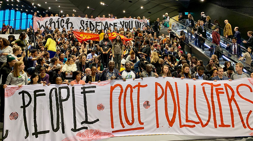 當地時間12月14日,在波蘭卡托維茲舉行的聯合國氣候大會進入最後一天。當天中午,上百名環保人士在會場中央舉行抗議,要求與會各國代表盡快形成共識,打破談判僵局,切實履行氣候承諾。 (中新社圖片/ 彭大偉 攝)