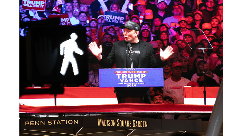 當地時間10月27日,美國共和黨總統候選人唐納德·特朗普、副總統候選人詹姆斯·萬斯在紐約舉行競選集會。圖為會場外屏幕直播美國知名企業家埃隆·馬斯克發言。 中新社