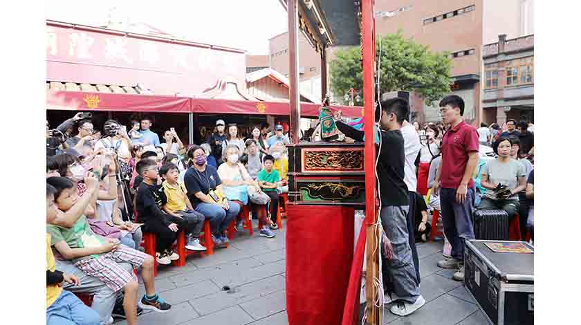 【圖片新聞】台北廟口布袋戲演出吸睛。11月3日,陳錫煌掌藝薪傳大師工作坊成果發表會在台北霞海城隍廟廟口舉行,多位學員展示學習布袋戲的成果,吸引不少觀眾。(中新社記者 陳小願 攝)