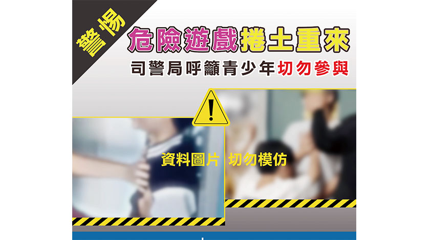 司警局在此特別提醒青少年玩樂時須注意安全並衡量後果,切勿為尋求一時刺激或抱持惡作劇心態而參與或模仿危險遊戲和行為,以免危及他人生命安全,導致悲劇發生並負上刑事責任。