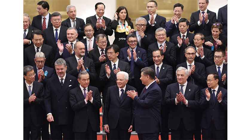 11月8日晚,中國國家主席習近平在北京同意大利總統馬塔雷拉共同會見出席中意文化合作機制大會和中意大學校長對話會的雙方代表。會見前,兩國元首同雙方代表合影留念。 中新社