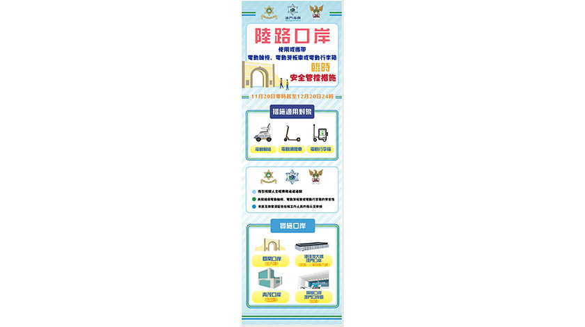 在此期間,市民及旅客使用或攜帶電動輪椅、電動滑板車或電動行李箱,經關閘口岸出、入境通關,或經港珠澳大橋澳門口岸出、入境(僅指由港來澳)通關,又或經青茂口岸及橫琴口岸澳門口岸區出境通關時,將由海關、治安警察局及消防局人員共同確保使用或攜帶上述物品之人士在安全情況下通關。為此,於以上口岸將對這些通關人士作出適當分流措施;另外,關閘口岸更設有專道供上述通關人士使用。敬請有關人士配合在場工作人員的指示及安排。