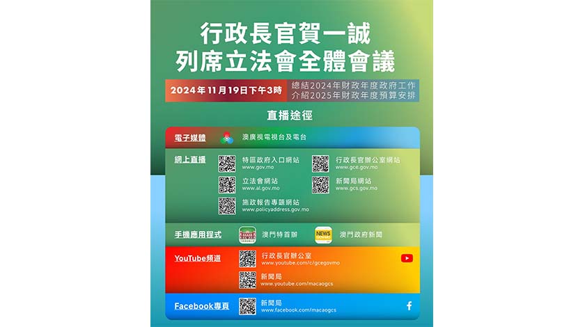 澳廣視屬下電視台及電台屆時將會現場直播。公眾亦可透過澳門特別行政區政府入口網站( www.gov.mo ),行政長官辦公室 ( www.gce.gov.mo )、立法會( www.al.gov.mo )和新聞局 ( www.gcs.gov.mo )的網站,施政報告專題網站( www.policyaddress.gov.mo ),行政長官辦公室(澳門特首辦)和新聞局(澳門政府新聞)的手機應用程式、行政長官辦公室( www.youtube.com/c/gcegovmo )和新聞局( www.youtube.com/macaogcs )的專屬Youtube頻道,以及新聞局Facebook專頁( www.facebook.com/macaogcs ),觀看網上直播。