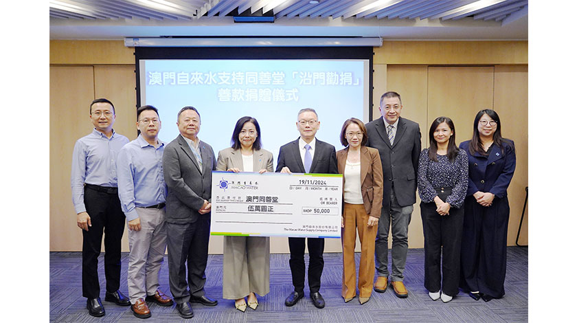 支票捐贈儀式於11月19日假青洲水廠行政大樓舉行,執行董事關小冰向同善堂致贈五萬澳門元,由同善堂值理會主席崔世平代表接收。出席儀式代表還包括同善堂值理黃焯華及莊麗晶,澳門自來水副總經理朱偉文、王榮集、李志土、財務總監何美儀等。