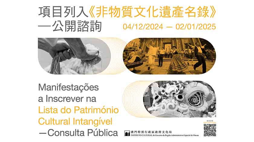 【特訊】為進一步加強對澳門非物質文化遺產的保護,文化局按照第11/2013號法律《文化遺產保護法》以及第85/2022號社會文化司司長批示核准《非物質文化遺產的管理指引》的規定,對新一批合共12個清單項目建議列入《非物質文化遺產名錄》進行為期30日的公開諮詢,以廣泛聽取社會各界的意見。