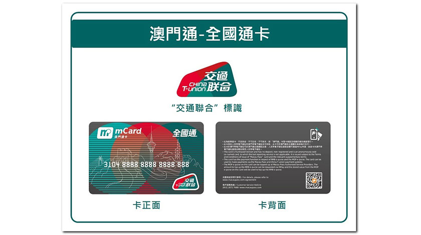 澳門通股份有限公司即日起發行帶有“交通聯合”標識的“澳門通—全國通”卡,除支持本地乘搭公共交通並享有車資優惠外,可通行全國主要城市乘搭主要公共交通工具。有關“澳門通—全國通”卡的購卡及使用詳情,可瀏覽發卡商澳門通公司網頁 https://www.macaupass.com/ 或致電澳門通客服熱線(853)2872 7688查詢。