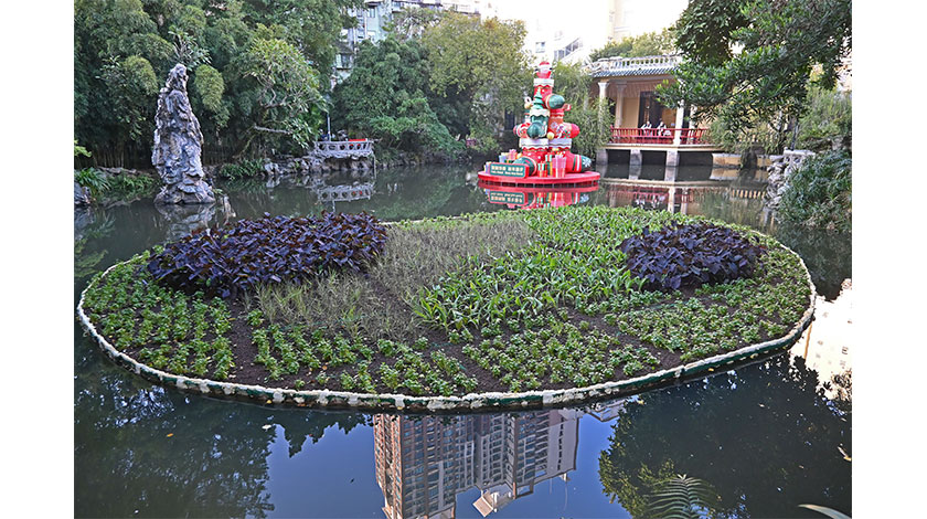 【圖片新聞】 市政署早前改善盧廉若公園池塘水體及清理累積的污染物,以改善水池生態。改善過後的池塘除新增了聖誕新年燈飾裝置外,塘中還多了一片花圃平台,整齊種滿數種植物,未知是否有新搞作,為盧九名園再添一筆。