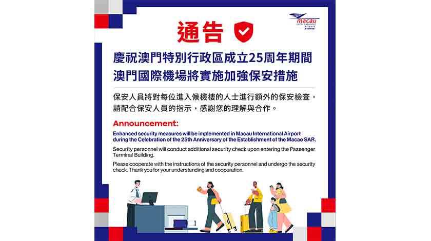 【特訊】為保障澳門特別行政區成立25周年慶祝活動的安全進行,澳門國際機場將於2024年12月16日至20日期間實施加強保安措施。
