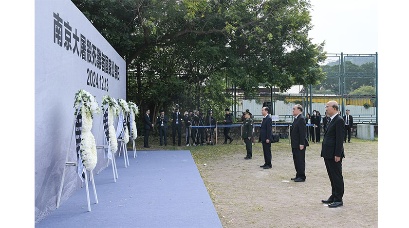保安部隊儀仗隊將寫上“沉痛悼念南京大屠殺死難者"的花圈放到公祭台上,賀一誠等 4名公祭代表分別上前整理花圈緞帶和鞠躬,然後全場默哀 1分鐘。