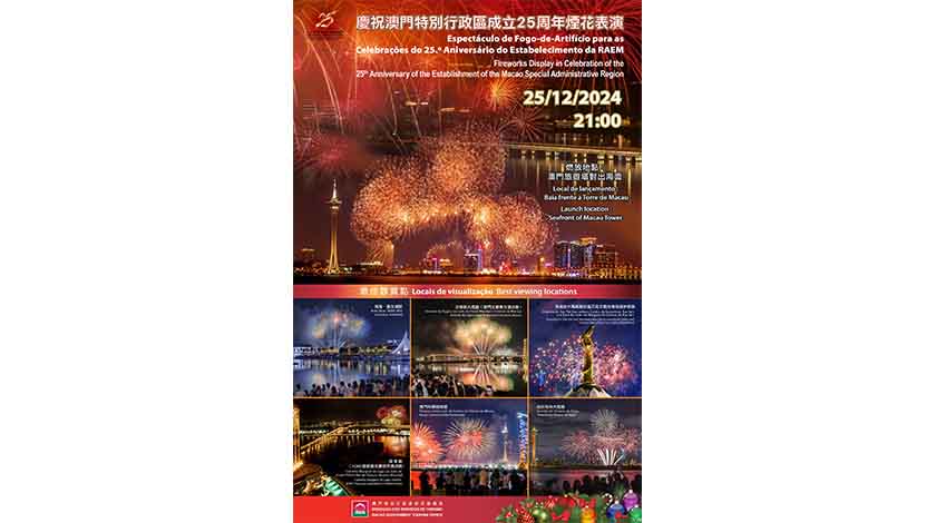 【特訊】今年為中華人民共和國成立75周年及澳門回歸祖國25周年,旅遊局將於12月25日晚上9時,在澳門旅遊塔對出海面舉行“慶祝澳門特別行政區成立25周年煙花表演”,向國家和澳門特區致以美好的祝願,為居民和旅客送上喜悅及祝福。煙花表演疊加“2024幻彩耀濠江”,加上煙花在聖誕假期燃放,全城將洋溢節慶熱鬧氣氛,展現澳門“旅遊+盛事”魅力。