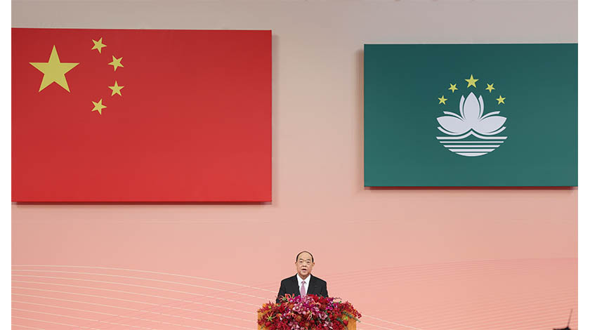 行政長官強調,偉大祖國是澳門繁榮穩定發展的最堅強後盾。國家一直把澳門作為掌上明珠,始終關心澳門同胞福祉,持續出台系列惠澳政策措施,不斷為澳門發展提供新機遇、新空間、新動力。澳門作為祖國大家庭一分子,必須在新時代新征程展現新擔當新作為,充分發揮特殊地位功能和獨特優勢,在融入國家發展大局中實現自身更好發展,為強國建設、民族復興偉業作出更大貢獻。他堅信,在習主席親切關懷和中央政府的大力支持下,第六任行政長官岑浩輝先生必將帶領新一屆政府和社會各界,譜寫出具有澳門特色的“一國兩制”實踐的新篇章。