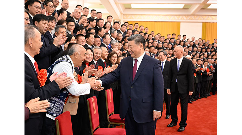 上午11時30分,習近平等來到人民大會堂北大廳,全場響起熱烈掌聲。習近平等同代表們親切握手,不時交談,併合影留念。