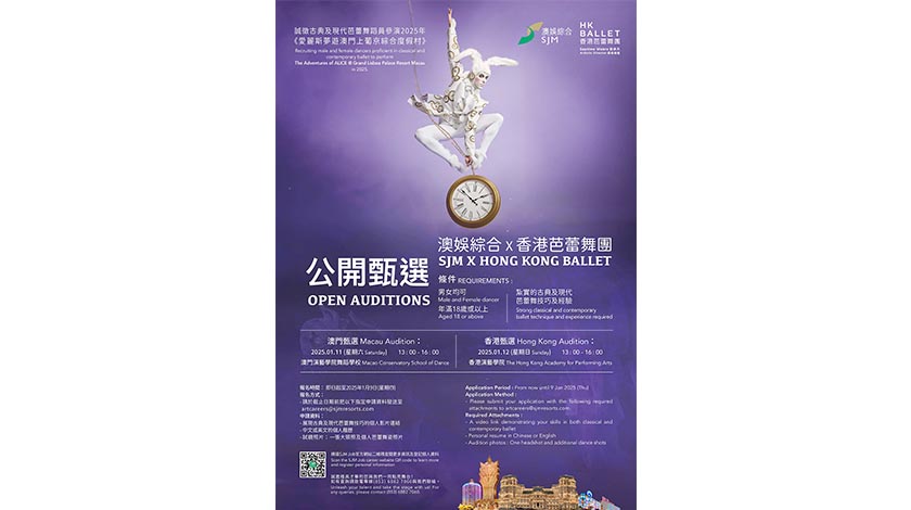 【特訊】澳娛綜合度假股份有限公司(「澳娛綜合」)攜手享譽國際的香港芭蕾舞團,誠邀擁有純熟舞蹈技巧、才華洋溢的男女古典芭蕾或當代舞者參加 2025 年全新駐場演出《愛麗斯夢遊澳門上葡京綜合度假村》的公開甄選。在資深藝術團隊的指導下,經典故事將以嶄新的視角呈現,結合富故事性的編舞、美輪美奐的服裝、以及引人入勝的舞台特效。入選舞者將獲簽短期演出合約,並在精彩演出中擔當重要角色,為不同年齡的觀眾帶來全新體驗。