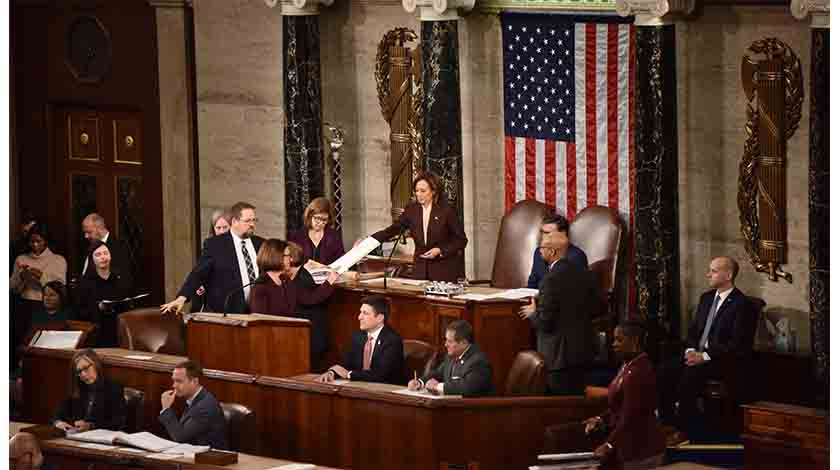 當地時間1月6日,美國國會點數選舉人票,正式確認前總統、共和黨總統候選人特朗普當選總統。圖為美國副總統哈里斯主持點數選舉人票儀式。 中新社