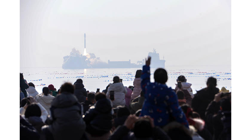 【中新社山東海陽1月13日電】:當日,捷龍三號遙五運載火箭搭乘“東方航天港”號海上發射船,在海陽市近海海域點火昇空,成功將微厘空間01組10顆衛星發射昇空。