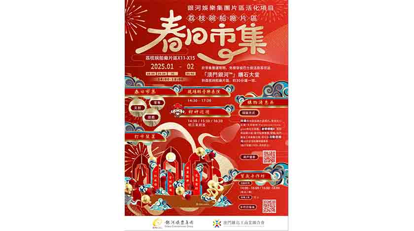 走出度假城,賓客還可以登上開篷觀光巴士,在星空下欣賞路氹城璀璨的賀年燈飾,體驗澳門流光溢彩的年味。或者到煥新開放的荔枝碗船廠片區體驗繽紛吸睛的新春裝飾,荔枝碗船廠片區春日市集自 1 月 18 日至 2 月 2 日逢周末及 1 月 31 日(農曆正月初三)開市,可在 18 個攤位上挑選富有本地特色的新年伴手禮,下午時段更有現場音樂表演烘托節慶氣氛,手工愛好者還可報名參加市集開設的春節飾品手作工作坊;另外荔枝碗船廠片區在 1 月 31 日(農曆正月初三)至 2 月 2 日(農曆正月初五)均有新春賀年活動,有財神巡遊表演和福袋派送,與市民恭賀新年。