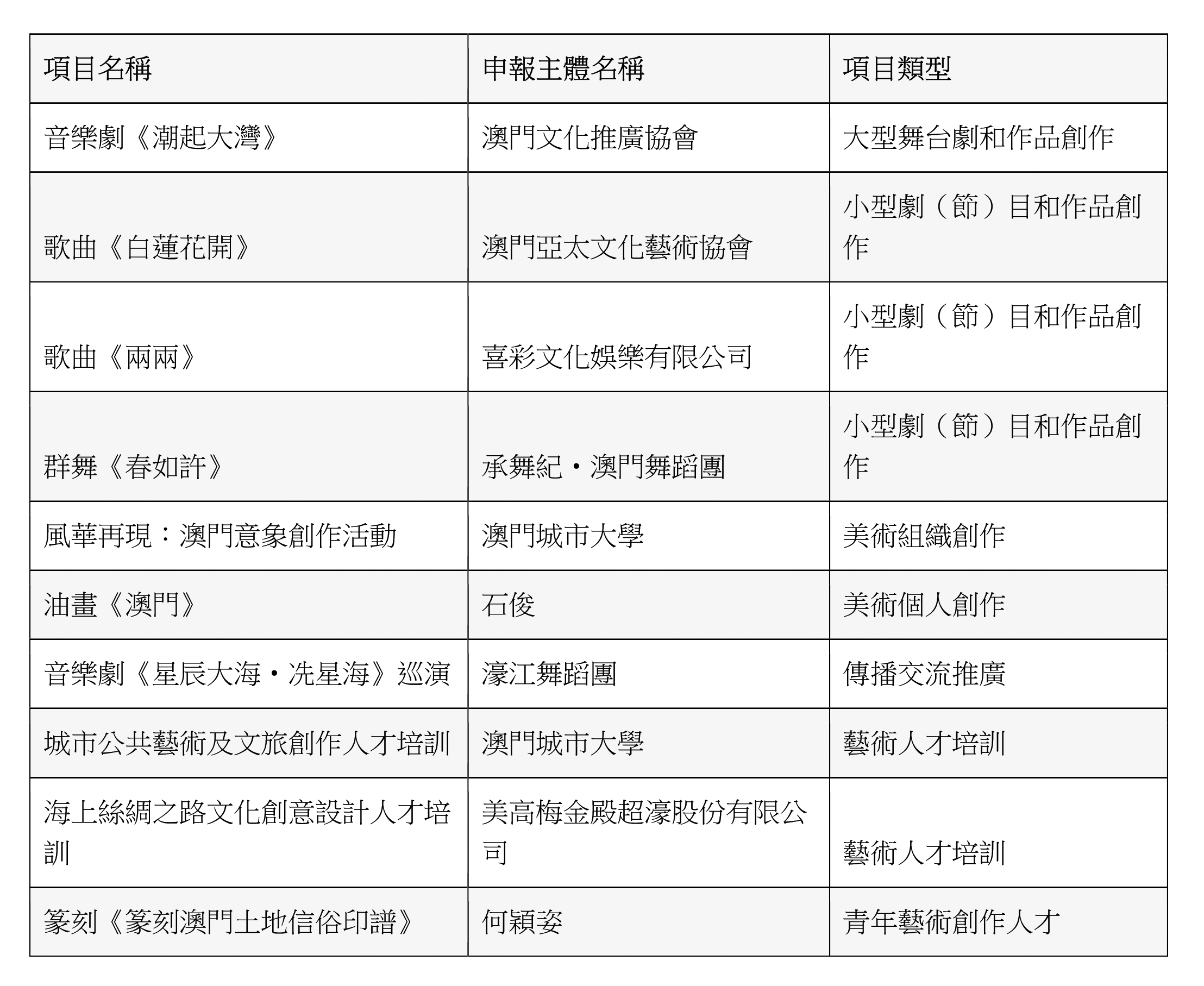 本澳入選的項目中,分別有1項大型舞台劇和作品創作,3項小型劇(節)目和作品創作,2項藝術人才培訓,而美術組織創作、美術個人創作、傳播交流推廣及青年藝術創作人才各有 1個項目。相關項目獲得國家藝文評審機制認可,為澳門藝文業界提供更多資源和平台,有助促進澳門藝文界的多元及專業化發展。
