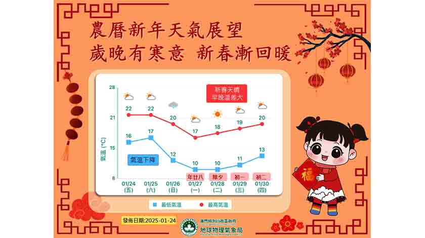 氣象局表示,與一股強烈冬季季風相關的強冷空氣,預計將於周日日間抵達廣東沿岸,預料屆時本澳的氣溫將顯著下降,北風亦將顯著增強,新春前夕(年廿八及年廿九)的最低氣溫將降至攝氏十度左右。