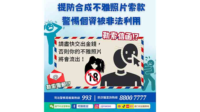 直至近日,司警局再接獲市民檢舉,報稱其辦公地點收到一封由外地郵寄送遞的勒索信函,信函內同樣附有合成的不雅照片。