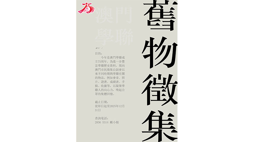 今年,適逢澳門學聯成立75周年的歷史時刻。為了進一步豐富和充實學聯的歷史資料,現正公開徵集與學聯相關的物品。這些徵集品包括會章、照片、證書、成績表、手稿、收據等,以凝聚學聯人的向心力,喚起公眾對學聯歷程的集體回憶。