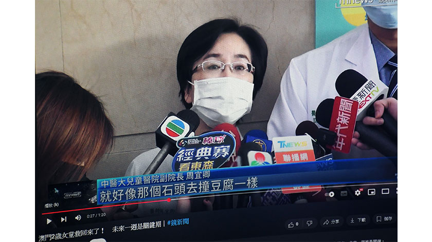 受傷的兩歲女童仍在台中的中國醫藥大學兒童醫院加護病房繼續治療,該院管理層昨早會見傳媒。中國醫藥大學兒童醫院副院長周宜卿表示,女童第一時間送到澄清醫院中港分院,後續轉送到中國醫藥大學兒童醫院搶救,在前日被送到醫院時已經重度昏迷。