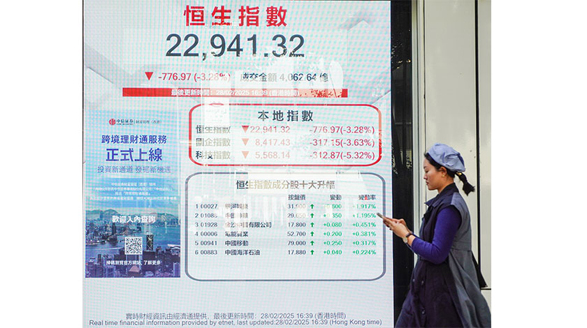 【香港中通社2月28日電】(記者 梁嘉軒 譚暢)港股28日尾市大跌,恆生指數收報22941點,跌776點或3.28%。大市全日成交約4063億港元。整個2月恒指升2716點或13.4%,連升三個月。