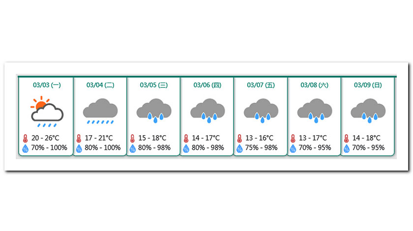 預測本周中後期受東北季風影響,氣溫將下降,多雲及間中有雨、北風較大,周五及周六最低氣溫約為十三度。