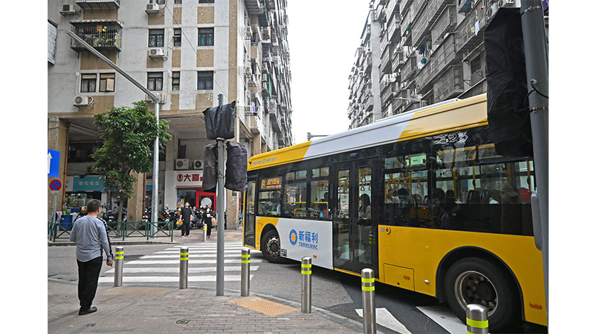 【圖片新聞】因一個多月前發生在斑馬線交通意外,交通事務局在看台街與中心街交界處加裝一組紅綠燈設施,擬取代該處四條過路斑馬線,全改燈控有關工程日前經已完成,目前交通燈以印有交局的黑套遮蓋,未知於何時啟用。