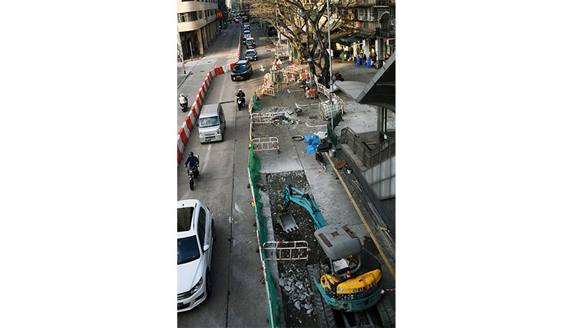 【圖片新聞】預計六月上旬完工的河邊新街路段重鋪及下水道維修工程在昨日開展。由三月十日至十九日,近小販巷的一段河邊新街(往媽閣方向)實施有限度通車(佔用一條車行道)。在昨午五時半後可以見到,交通算是暢順,但已經沒有人員動工。
