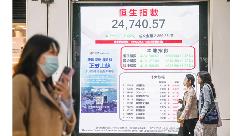 【香港中通社3月18日電】(記者 梁嘉軒)受中美關係相關利好消息帶動,港股18日一度急升近600點,恆生指數連升三日,累積升1277點或5.4%。大市全日成交2859.35億港元。