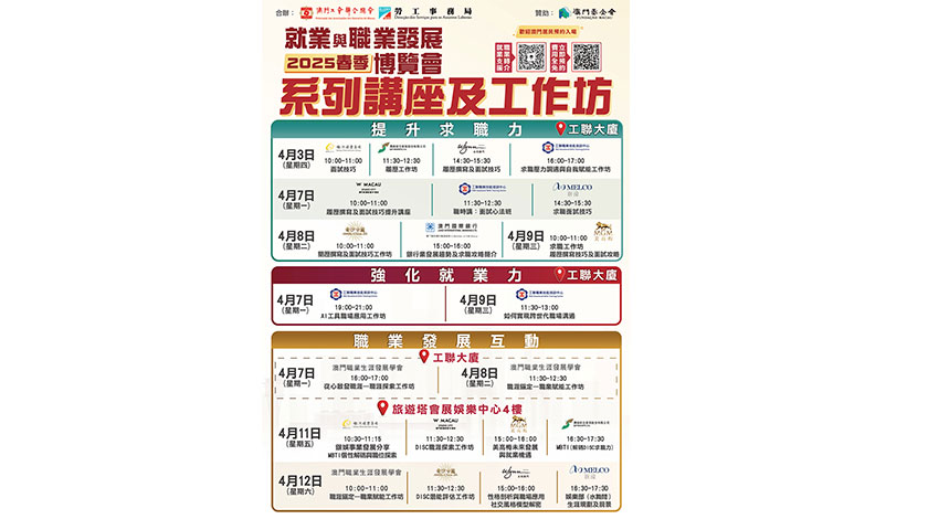 職涯服務團隊駐場服務。招聘博覽上,工聯職涯服務團隊將駐場為職工提供職業規劃與就業指導服務,團隊目前由24位考獲專業認證的生涯規劃師組成。團隊已為近二千名僱員舉辦逾80場相應活動,覆蓋生涯探索工作坊、實用就業能力技巧指導,個人測評及職業互動體驗等。多場系列講座及工作坊明開放線上報名。有意參與系列講座及工作坊的本澳居民,可線上報名,明日起登入以下專頁進行線上報名登記https://www.dsal.gov.mo/zh_tw/standard/job_and_career_development_expo01.html,成功報名人士將會收到短訊確認,憑短訊簽到進場參與,名額有限,額滿即止。入場報名時間將於3月31日開放網上預約入場;如對系列講座及工作坊有興趣,可於辦公時間內致電勞工事務局(電話:28722108)或工聯職介部(電話:28569362)查詢。