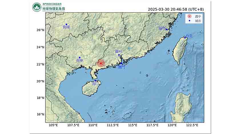 根據氣象局初步分析報告,在本地時間昨晚8時46分58秒,於廣東省茂名高州市發生3.0級地震,震源深度約為10公里,震中約位於北緯22.13度,東經110.98度,距離澳門西約267公里。