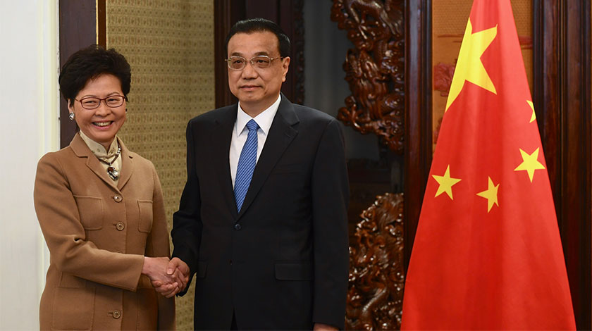 12月17日上午,香港特區行政長官林鄭月娥(左)在北京向國務院總理李克強述職,匯報香港的最新情況。(香港中通社)
