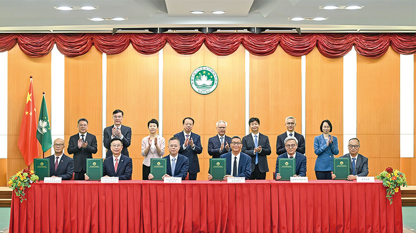 【特訊】行政長官岑浩輝昨日在政府總部與上海市市長龔正會面,雙方就滬澳新一輪務實合作重點領域和項目、攜手服務好國家發展大局,以及兩地經濟社會發展等議題交流意見。會面後雙方共同見證了滬澳兩地多項合作協議的簽署儀式(見圖)。