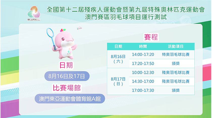 殘運會和特奧會羽毛球運行測試均在澳門東亞運動會體育館A館進行,8月16日下午2時將率先進行特奧會羽毛球運行測試,而殘運會羽毛球運行測試邀請了本地和廣東球隊作賽,賽事將於8月17日上午10時至下午5時30分舉行。是次項目運行測試按照正賽的標準和要求,對賽事組織的各個籌備環節進行檢視,為12月舉行的殘特奧會做足準備。