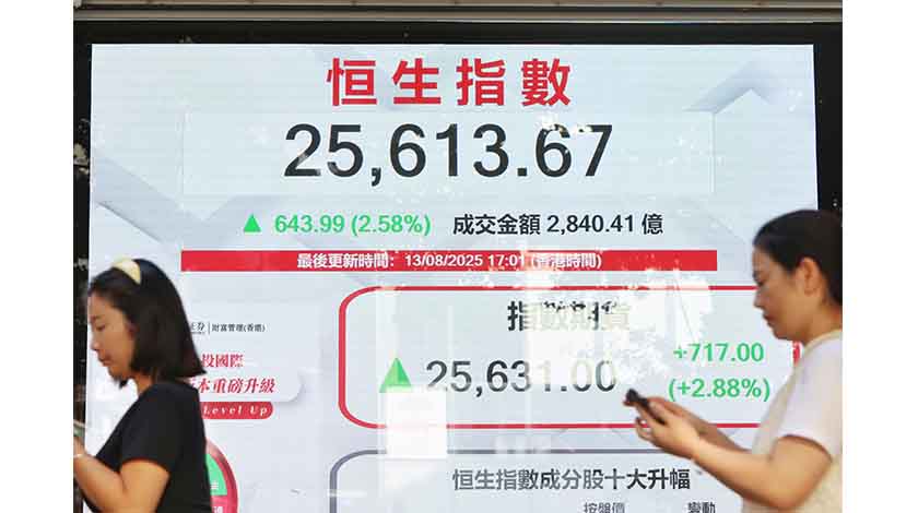 【香港中通社8月13日電】(記者 譚暢)港股連升三天,13日在亞太區股市帶動下以全日高位收市,恆生指數收報25613點,升643點或2.6%。大市全日成交額約為2840.4億港元。