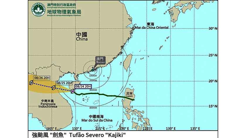 昨晚八時,已增強為強颱風的「劍魚」集結在本澳西南約六百四十公里處 ﹝約北緯 18.0 度,東經 109.4 度﹞,以時速約十五公里向西北偏西方向移動,進一步遠離本澳,大致趨向越南。